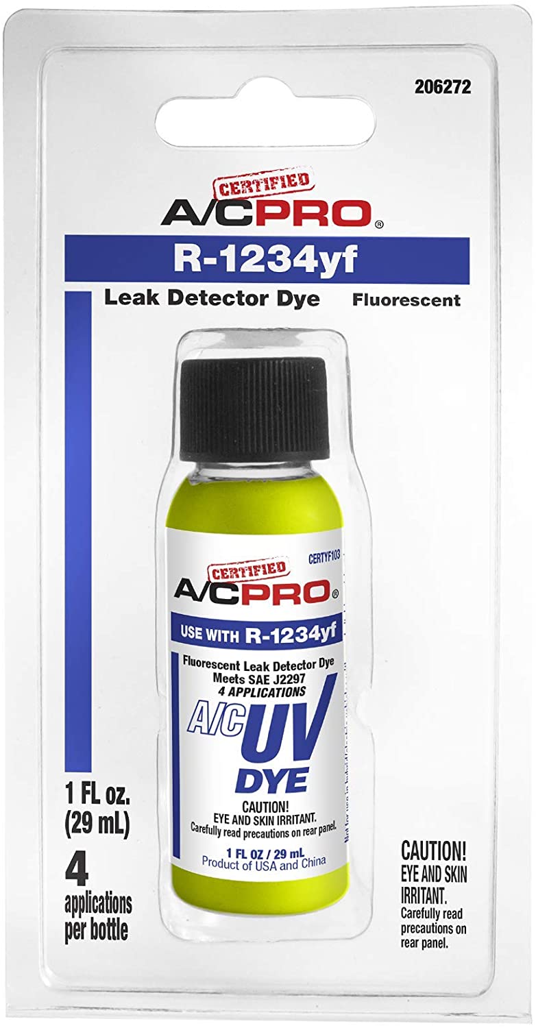 Certified A/C Pro Auto Air Conditioning R-1234yf Leak Detection Dye is used to locate leaks in R-1234yf vehicle A/C systems. Use the leak detection dye to know if you have a large leak that needs physical repair and what part has the issue. Compatible with PAG, Ester, and mineral based refrigerant oils found in R-1234yf systems.