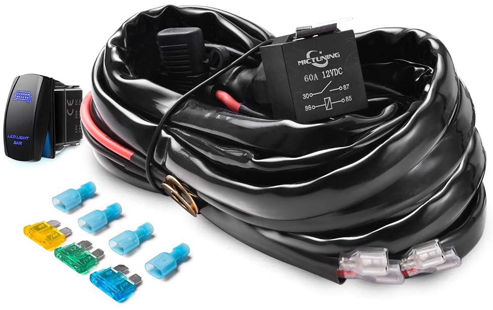 MICTUNING HD+ 12 Gauge LED Light Bar Wiring Harness Kit with 60Amp Relay, 3 Free Fuse, Rocker Switch Blue(2 Lead)