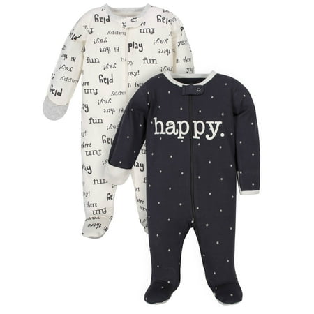 - Sleep 'n Plays: crewneck; long sleeves; zip front closure; covered feet