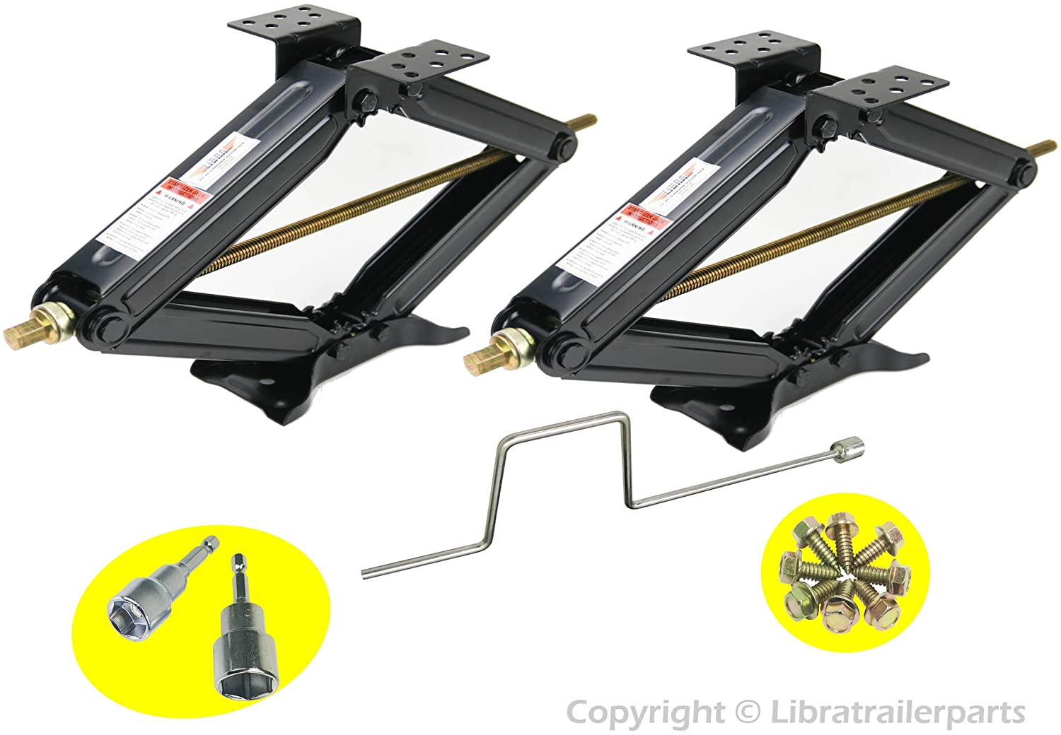 These 2 leveling scissor jacks with 5,000-lb capacity each will keep your RV level and stable. Each adjusts from 4" to 24" inches as your situation requires, and the bow-tie base steadies the jack on soft surfaces. Features: Stabilizing and leveling camper, Remains steady on soft surfaces because of wide bow-tie base Bolts or welds on Includes 2 steel jacks and 1 crank handle Specs: Capacity: 5,000 lbs per jack. Extended height: 24" Retracted height: 4" These stabilizer jacks are only used on RV/trailers for stabilizing and leveling purpose. Never use for lifting, changing tires or supporting weight of any vehicles. Improper use can result in property damage, serious injury or death and will void the warranty.