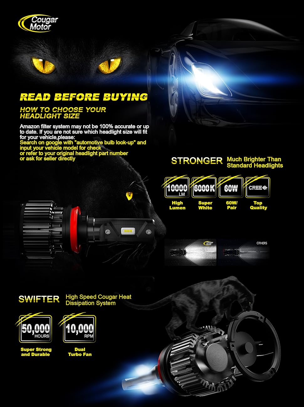 Product Description Cougar Motor H11 (H8 H9) LED Headlight Kit Each Cougar Motor headlight is laser aligned to the base during the manufacturing process to ensure a perfect...