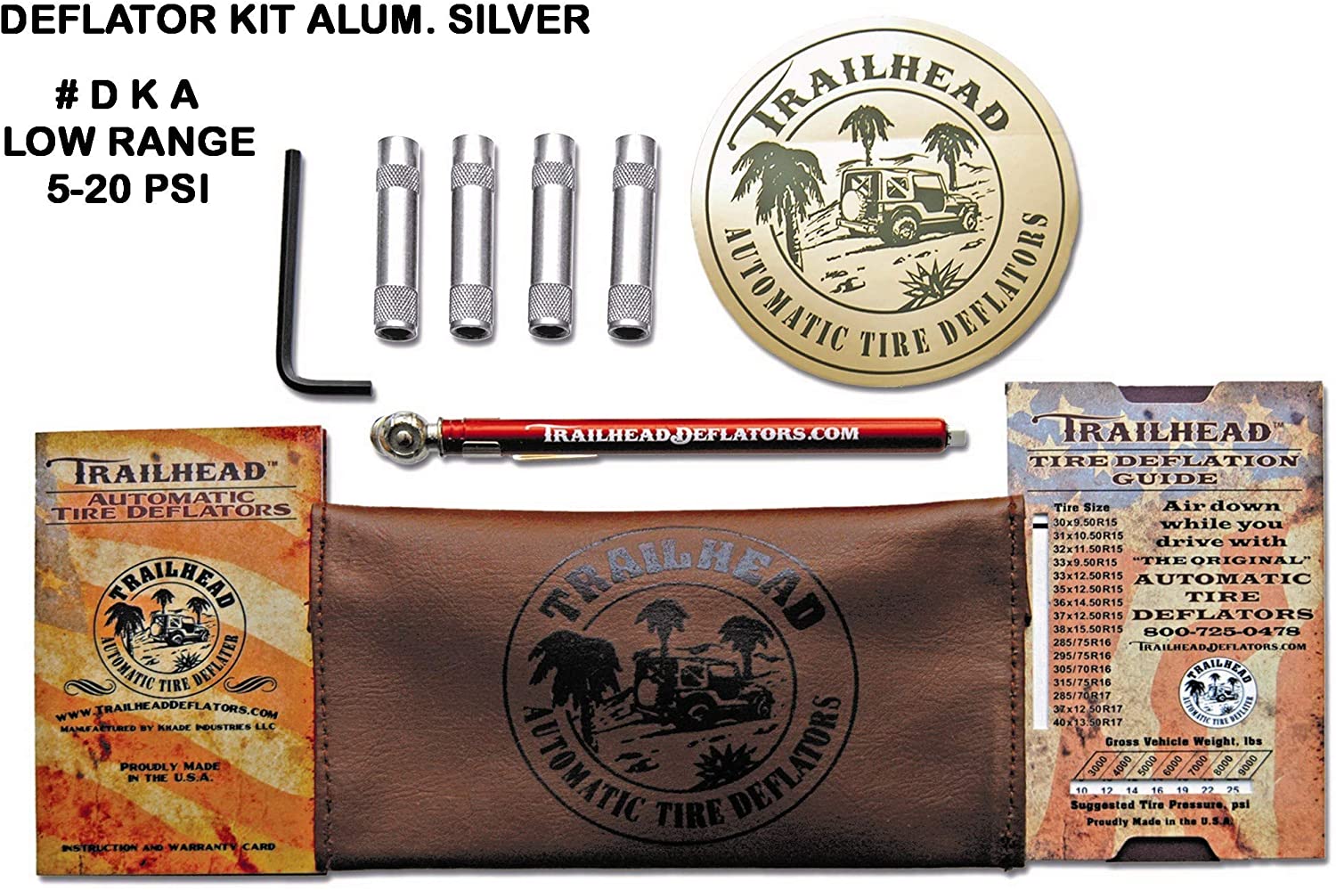 Trailhead - THE ORIGINAL Automatic Tire Deflator. Trailhead deflator kits are the only complete air down kit made in the USA, having all the necessary components for airing down, even if it’s your first time on the trail, or at the beach. Trailhead makes it easy to adjust the PSI. Trailhead kits provide the user with unlimited PSI adjustment, a deflation guide chart, and a tire gauge making it easy to air down. We are extremely proud of the fact that Trailhead has the distinction of being the best automatic tire deflator made and carries a LIFETIME WARRANTY. United Four-Wheel Drive Associations has given their support to Trailhead deflators, along with all the beach buggy associations. From the start Trailhead has maintained it quality throughout the past 25 years. Trailhead is 100% manufactured in the USA. Using alloy air craft aluminum, the Trailhead deflator has been crafted to be ultra-light with a slim body design. Trailhead has (Posi – Lock) set point adjustment inside the body, thus making the deflator suited to airing down while you drive, NO jam – nuts, external screws to loosen and fail being lost on the sandy beach or trail, and no worry about accidentally changing the pressure settings when installing or removing them. These features set Trailhead deflators apart from any other deflators in the market.