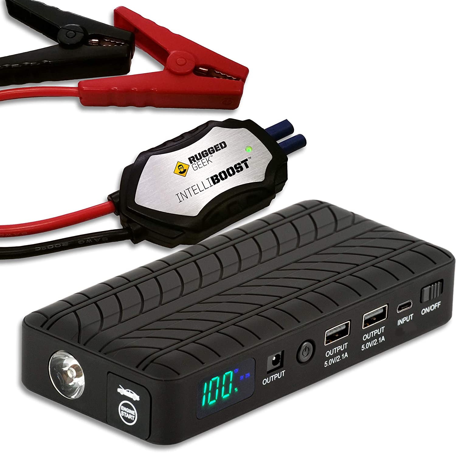Rugged Geek RG1000 INTELLIBOOST 1000A Portable Auto Jump Starter and Power Supply with LCD Display. USB Laptop Charging. Emergency Auto Jump Box for 12V vehicles such as Cars, Trucks, SUVs and more