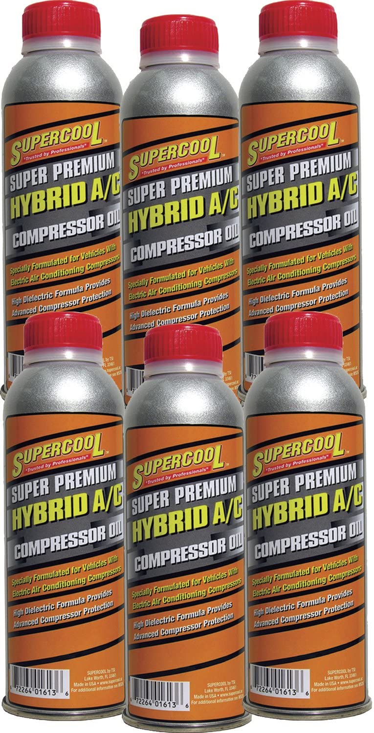 TSI Supercool 24940 Hybrid A/C Compressor Oil - 8-Ounces - Case of 6 is a synthetic lubricant specially formulated for electric hybrid A/C compressors. The high dielectric protection formula provides excellent resistivity to potential electric current leakage in high voltage hybrid A/C systems. This oil contains conditioners, inhibitors and anti-wear agents. It is endorsed by the Automotive Career Development Center - a worldwide leader in Hybrid Training. Supercool customers receive industry's leading technology in all fluids with lubricants and UV dye's formulated to meet or exceed OEM performance specifications. In addition, all lubricants are top-off compatible with their corresponding OEM and aftermarket equivalents. Designed for real-world operating conditions, they provide an unsurpassed level of service, performance, protection, and fluid life.