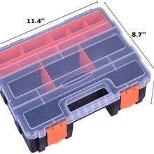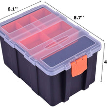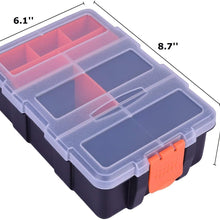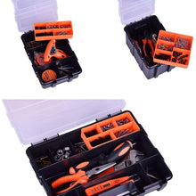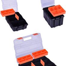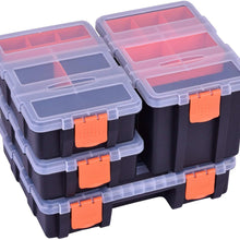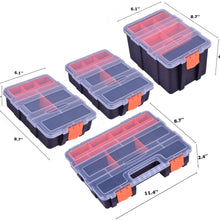 Easyzon tool organizer offers you a practical solution to store your tools, hardware, and small parts in 4 toolboxes: 1 box with removable tray, 2 identical medium organizers with fixed and removable compartments, 1 large portable organizer with handle, fixed and removable compartments, Transparent lid that will allow you to find what you want easily, Made from eco-friendly PP material not only can support heavy loads but also safe to use. The black and orange colors give a very stylish and unique appearance to the tool box organizers. Perfect for multi-purpose use in shop, home, garage, vehicles, outdoor places or for hobbies of collections.