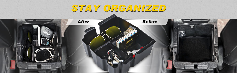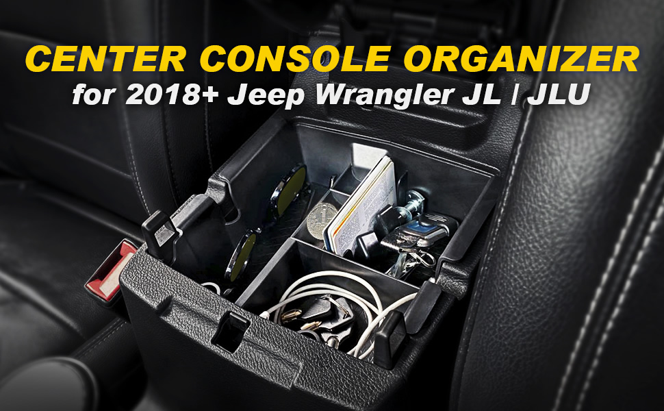 STAY ORGANIZED - Xprite Center Console Organizer Perfect match with your JL, Custom molded to fit the Original armest compartment, eliminates the clutter in the center console, you can classify coin, card, phone and sunglass box in a tidy room, Maximize Your JL interior storage and organize the center console.