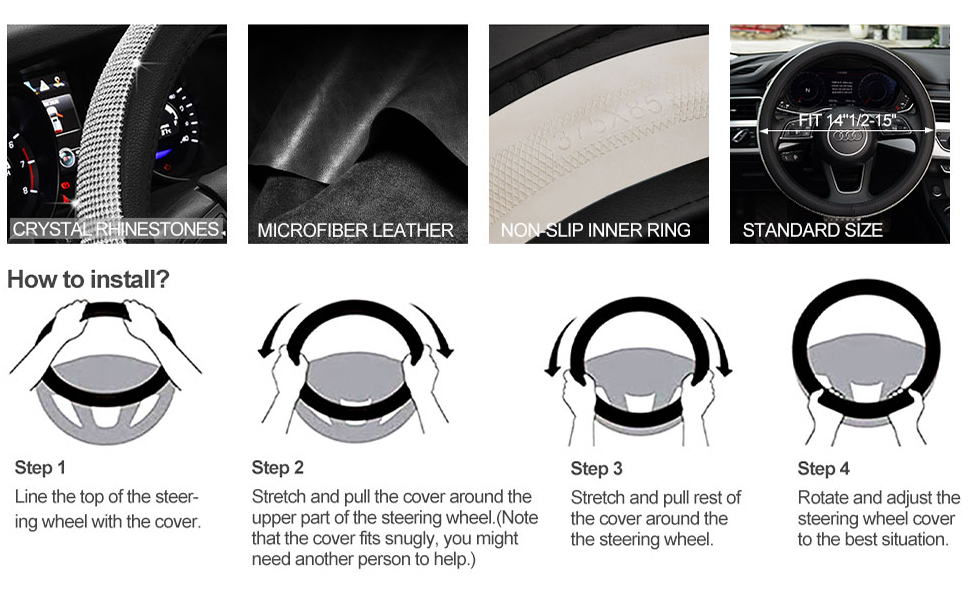 KAFEEK Diamond Leather Steering Wheel Cover with Bling Bling Crystal Rhinestones, Universal 15 inch Anti-Slip, Black Microfiber Leather White Diamond.