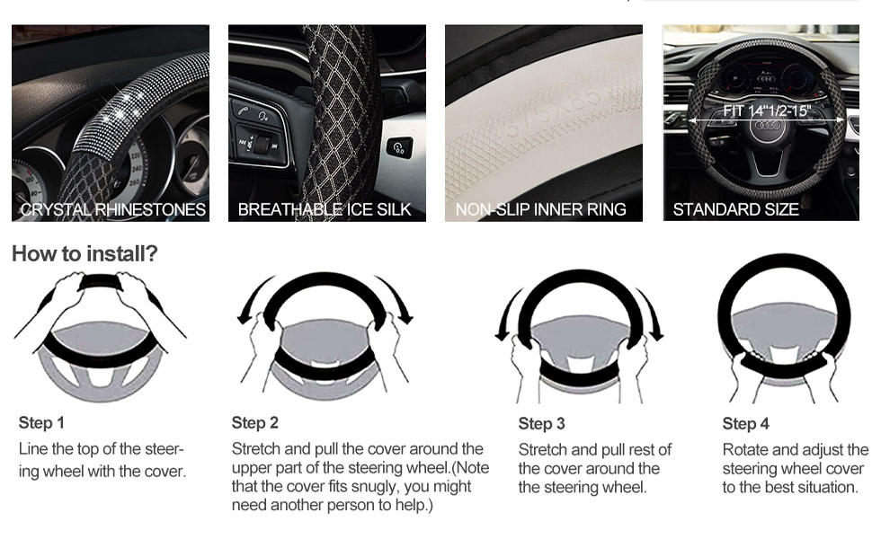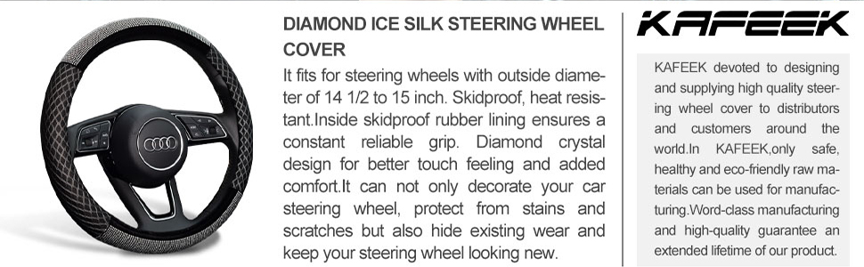 KAFEEK Diamond Steering Wheel Cover with Bling Bling Crystal Rhinestones, Universal 15 inch Anti-Slip, Breathable Ice Silk Black Diamond