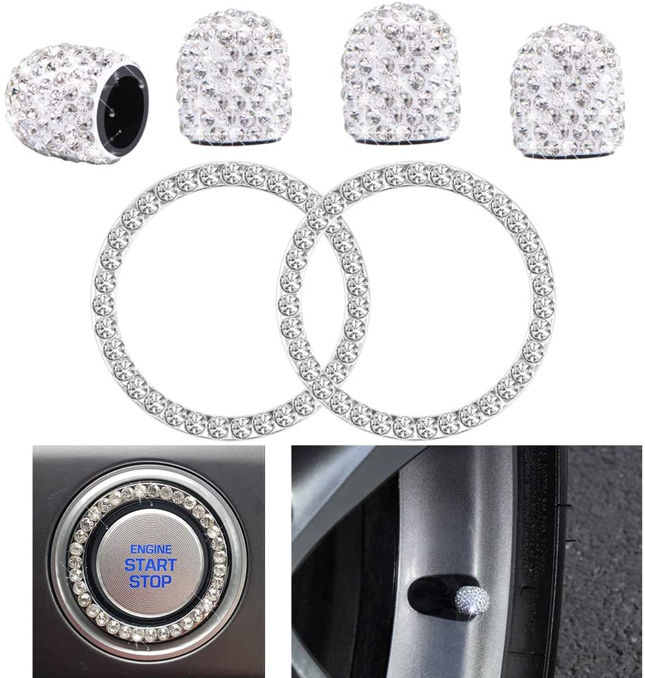 4PCS Crystal Rhinestone Universal Stem Covers with 2Pcs Car Decor Crystal Rhinestone Bling Sticker Emblem Ring for Car Engine Ignition Button Key & Knobs, Unique Gift (Silver)