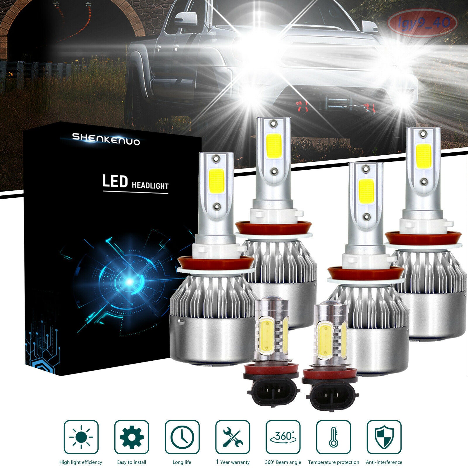 Plug Type: H11 + H11, Hi-Low Beam Power(per set): 110W/Set,55W/bulb Luminous Flux: 10000lm/set (5000lm/bulb) Operating Voltage: DC 9-32V(fit 12V,24V vehicles) Color Temperature: Pure White 6000K - 6500K IP67 rated water and dust seal,over 50000hrs lifetime Beam Angle: 270 degree@low beam,360 degree@high beam Material: Aviation 6063 aluminum profile Operating Temperature: -40-80 degree Celsius Usage: Headlight, Fog light (2pcs/set) Bridgelux COB Hi-Lo Beam LED headlight conversion kit Latest Bridgelux COB chip light source,4 luminous faces(270/360 degree) no blind zone Engineering beam pattern design throw more light on road evenly at appropriate angle without foggy light Xenon white light reflect road paint/signs better to show clearer road situation during night driving 270 degree low beam angle with cut-off line,will not dazzle oncoming traffic All-in-one heat conduction+high speed mute fan system keep the light bulb in appropriate working temperature Built-in constant current CPU, instant full brightness without start-up relay Two-way heat dissipation channel 1.All-in-one aluminum profile as heat conduction system, 360 degree heat radiating 2.High speed mute fan (12000R/Min),high Air flow for faster cooling rate Fog light: Plug Type: H11 Voltage: DC10- 24V Colour: 6000K/ White Wattage: 100W Surface Finish: Virtually Unbreakable PMMA Lens Lifespan: >50, 000 hrs Light Color: White This new product has high luminous efficiency, low power consumption and long service life. High power, can reach 100W Easy installation, Direct plug in and play. Best used for Fog/ Driving lights/ Daytime Running Light DRL Faster on/ off response time Energy saving, environmental protection, Stable performance, through strict test, Use safer driving Package Included: 2 x High Beam LED headlight bulbs 2 x Low Beam LED headlight bulbs 2 x LED fog bulbs