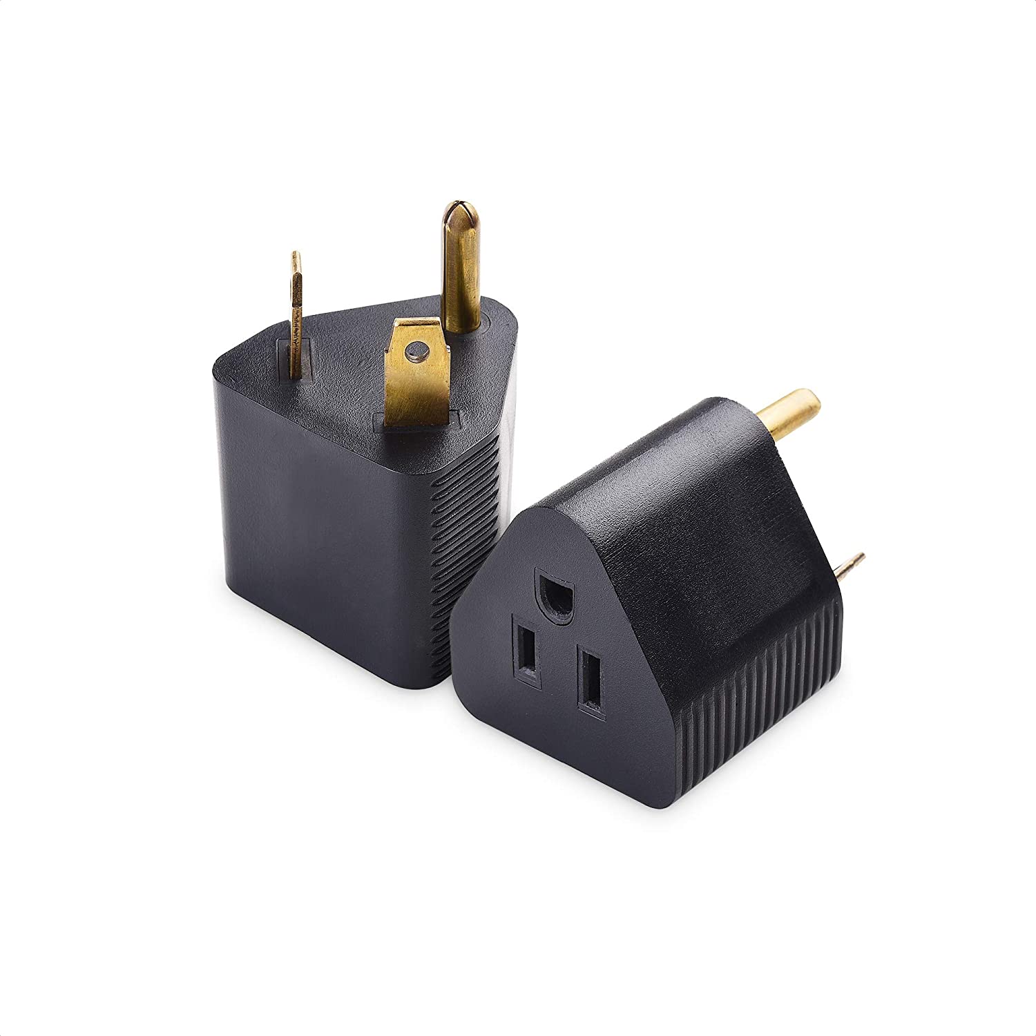 The Cable Matters 2-Pack 3-Prong 30 Amp to 15 Amp RV adapter is an indispensable power utility for RV, camper, or portable generator owners. This small, portable, and powerful adapter safely converts any TT-30R receptacle into 15-Amp service using standard 5-15P household power plugs.