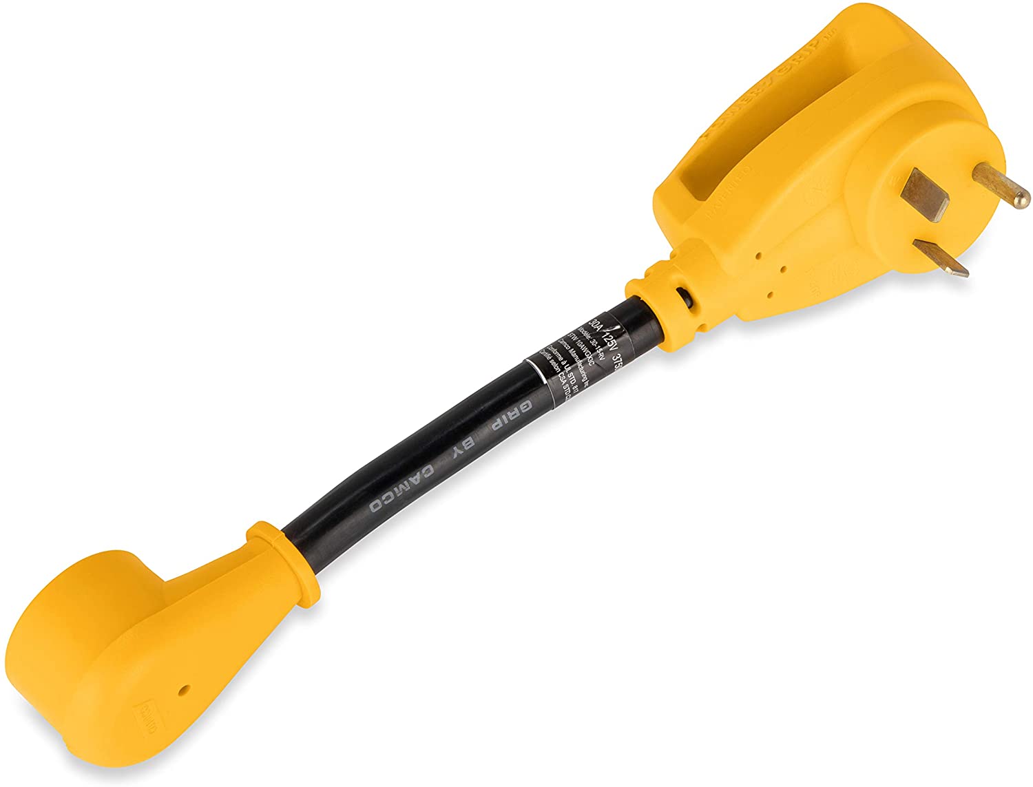 Camco (55165) Heavy Duty RV Dogbone Electrical Adapter with Innovative 180 Degree Bend Design and Easy PowerGrip Handle - 15 Amp Male to 30 Amp Female, 12"