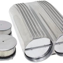 Finned polished aluminum shotgun style hood scoop air cleaner. Includes two air filters, all the necessary mounting hardware, and the plates to mount to dual 4 barrel carburetor. It will fit most 4 barrel carburetors with a 5-1/8" diameter neck including most Edlebrock, Holley, Rochester and Carter. Dimensions: 20"L x 10-1/2"W x 5"H.