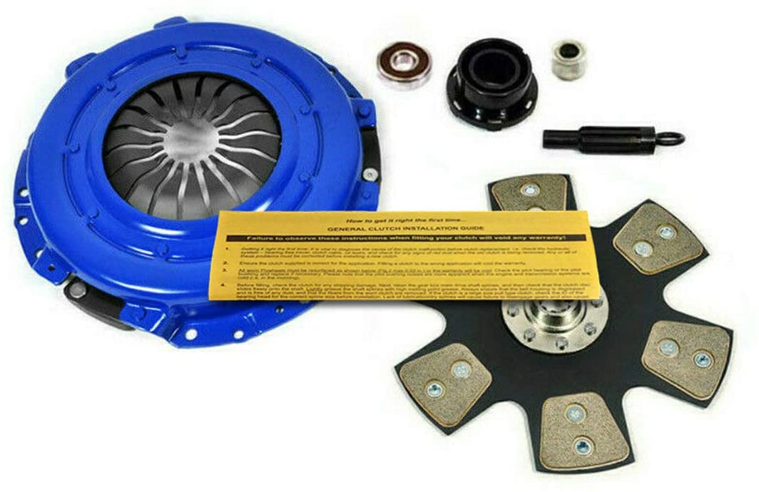 EFT Stage 4 clutch kit is a direct factory replacement clutch kit and it's designed for those who seek the ultimate in clutch performance and reliability. EFT clutch kit includes only the highest grade clutch components from the world's leading racing clutch manufacturers. The 6-puck copper ceramic (also known as MIBA) disc features 12 high-coefficient friction pads that are resistant to slippage and ensures long lasting life. The heavy-duty solid spline center unit boasts heat treated chromoly for the maximum power and durability. The EFT pressure plate features special single diaphragm design to increase clamp load. It features induction hardened diaphragm, CNC machined castings, stronger drive straps and rivets. EFT pressure plate provides smooth and precise feel with easy modulation. All EFT pressure plate is load tested on a special testing tool for quality assurance.