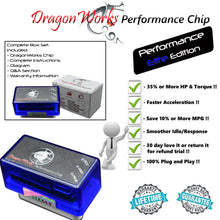 We use the latest in computer/vehicle interface to achieve maximum performance and fuel economy! Introducing: The new stronger and faster DragonWorks Performance Chip Elite edition. This has been a lot if hard work but we finally created a product that is worthy of our name! The Elite edition delivers on amazing performance gains and fuel economy while still maintaining 100% safety of your vehicle electronics and mechanical parts! Our Elite edition chip is dyno proven with the highest gains on this market! Dont confuse this product for some cheap "fits all vehicles and best tunes" knockoff. Our chip delivers you full power through CUSTOM tunes for your vehicle alone. You simply plug it into your OBD2 port and get ready for proven performance! Give our chip a try with a 100% satisfaction guarantee or 100% money back! Once you try it you will buy more, we guarantee it! ** Up to 35% or more in HP gains! ** Up to 30% or more in Torque gains! ** Reduce fuel consumption up to 15% ** Smoother/Stronger Shifting ** Smoother idle ** Faster Throttle response ** Eliminates response lag on Engines/Turbos/SuperChargers ** Faster Spool up (on tubo and supercharged cars) ** Cleaner running engine ** DOES NOT REQUIRE PREMIUM GAS! ** Easy push button feature ** Easy to read LED indicator functions ** 100% Safe for your vehicle! ** 100% Plug & Play Design! ** Installs in only 60 Seconds! ** Dyno Tested and Proven Gains across whole band! ** 100% Satisfaction Guarantee with full refund! ** Complete Custom programmed to your vehicle and any mods you have done to give the most performance you can get on the market! ** 24/7 SMS Support! ** 30 Days to try it and if not happy return it for FULL refund! ** We even pay return shipping!