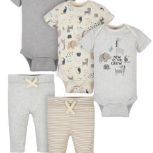 - 5-piece bundle includes: three onesie bodysuits and two pairs of pants