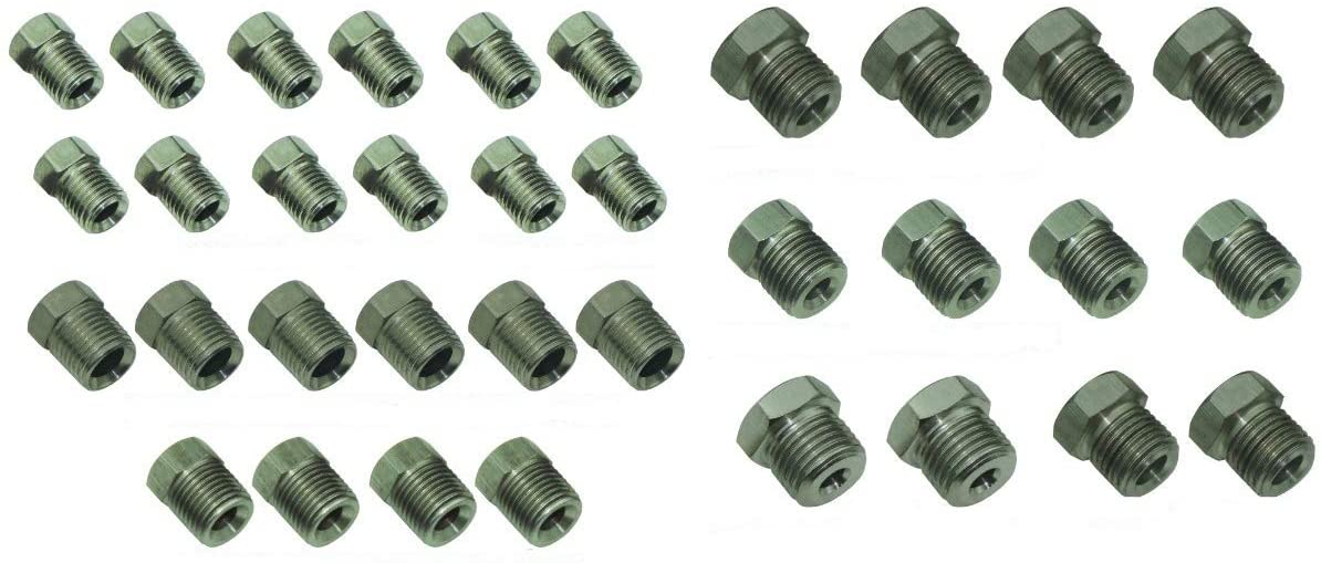 Automotive Brake Line Plated Stainless Steel Fitting Pack - (12) 3/8-24 STN01, (4) 7/16-24 STN06, (4) 1/2-20 STN04, (4) 9/16-18 STN14, (6) 7/16-24 STN12, (2) 9/16-18 STN07, (2) 1/2-20 STN14. All the sizes to plumb any car or truck. These are all stainless steel fittings used for 3/16 1/4 brake line - all the correct sizes for the master cylinder, brake valve, rubber flex hoses, wheel cylinders, calipers and any other brake component. These are exact to the factory originals and have all the details - they are the correct size and shape with the correct color. This is a exact Inline Tube reproduction of the original.