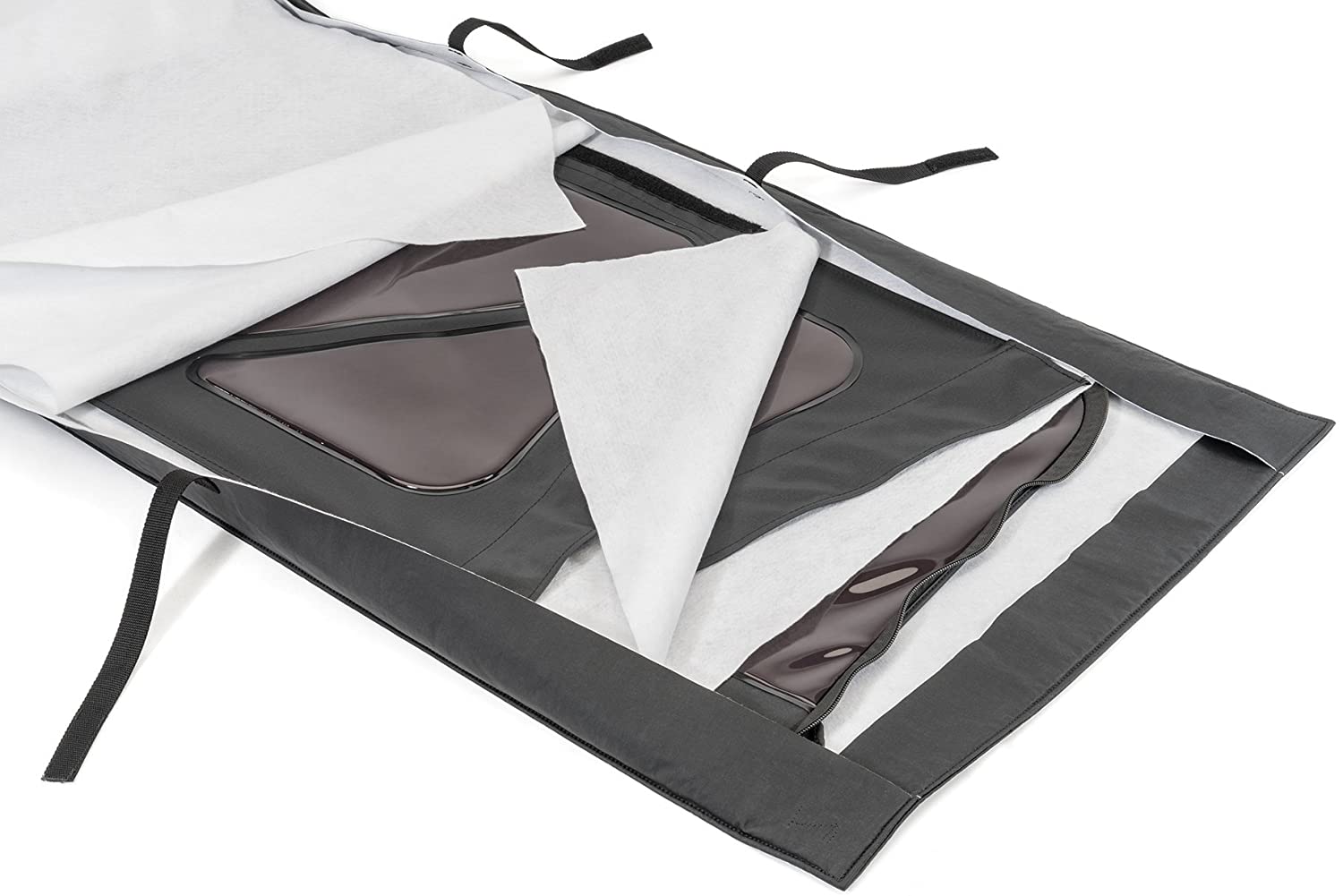 The most versatile window storage solution ever created for Jeep soft top windows. Master Top Soft Protect Window Roll pampers your window glass while protecting it from scratches and chemical reactions. This easy to use window roll is constructed of durable vinyl coated Foss back soft top material with 3 soft inner non-static ultra-soft felt panels to protect your tops PVC glass. The unique design allows you to roll up your windows in soft fabric two different ways; one direction rolls the windows up so they can be easily stored behind the seat in the storage area of your Jeep. Roll in the other direction, and the longer roll can easily be secured on top of your folded down soft top behind the rear sport bar with attached straps. The ultimate in flexibility! Now you can safely remove your soft top windows and easily bring them with you without worrying about damage. Each Soft Protect Window Roll secures your rear quarter windows and rear window (three windows total). Soft upper doors will not fit in the window roll.