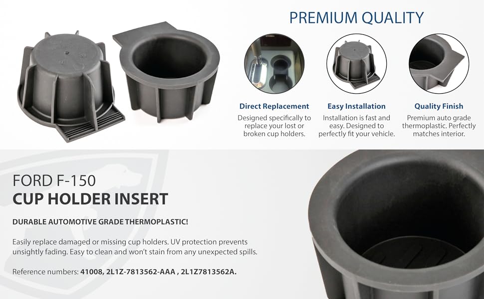 Built tough, these premium, rugged, quality Red Hound Auto Center Console Cup Holder Inserts are factory tested and made from the highest quality industrial grade materials. Designed specifically to fit: 2009-2014 F150 Trucks WITHOUT Flow-Through Center Console; review photos to verify what center console you have. The cup holders will sit side by side rather then front to back.  Reference Numbers: 2L1Z-7813562-AAA , 2L1Z7813562A.