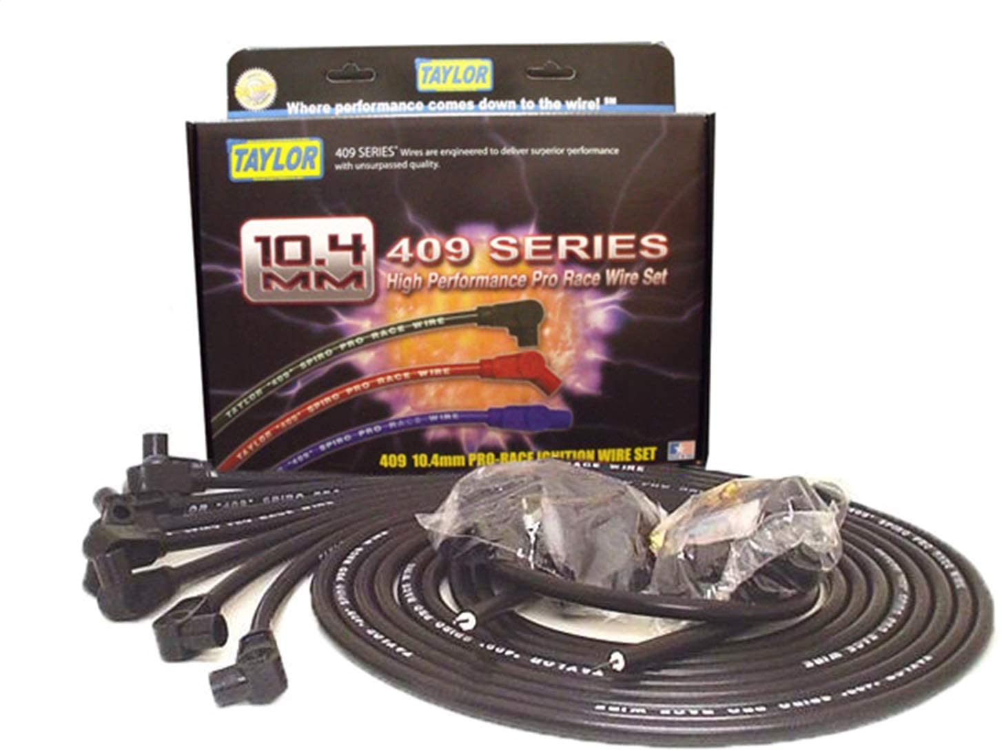 This black 10.4mm spiro-wound wire is used when radio frequency interference suppression is required and works with multiple spark discharge systems, on-board computers, and electronic ignitions. The wires are terminated and booted at both ends, can withstand temperatures up to 600-degrees F, and feature 102,000-volts of dielectric strength.