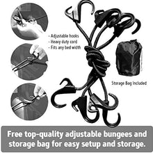Heavy duty metal rings are fused in all eight bag corners in order to easily fasten the truck bag to any truck. Four adjustable bungee cords are included with each Tuff Truck Bag.